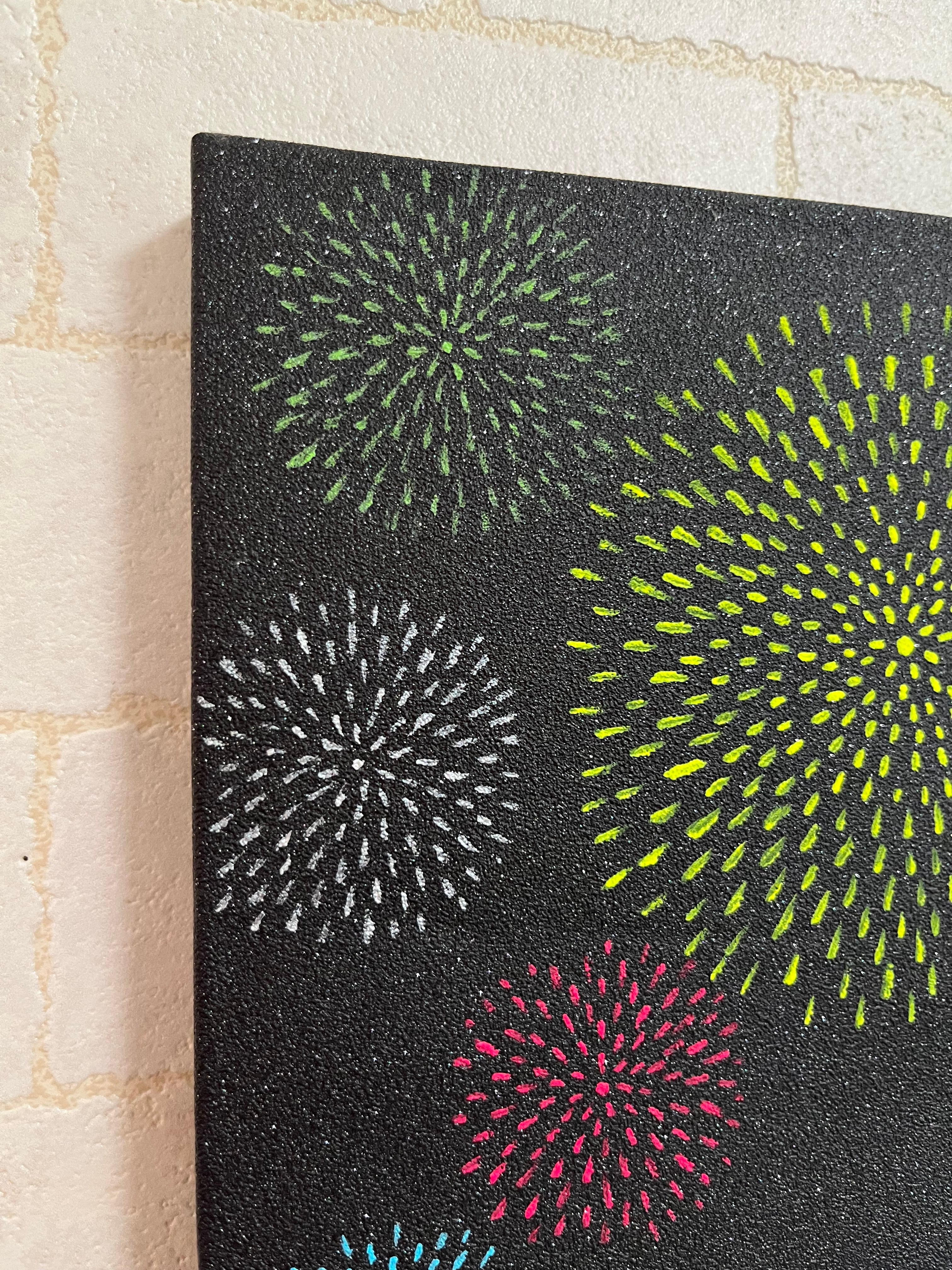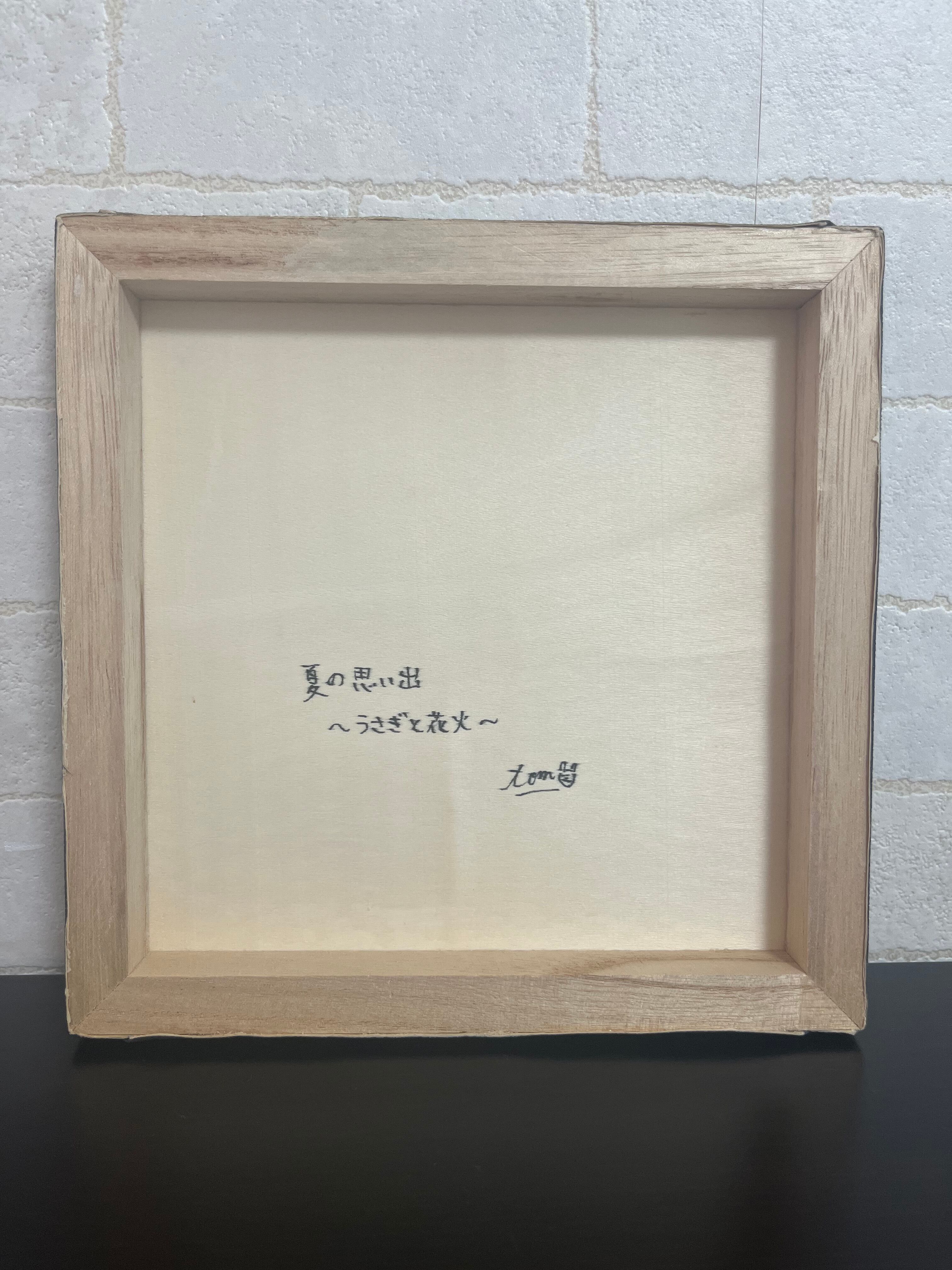 木製パネルに、きらめくラメの壁紙を貼り、その上にアクリルで描いた夏の夜のひと場面。