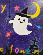 ハロウィン気分を楽しめる、明るくポップな一点物の手描きアートです。
