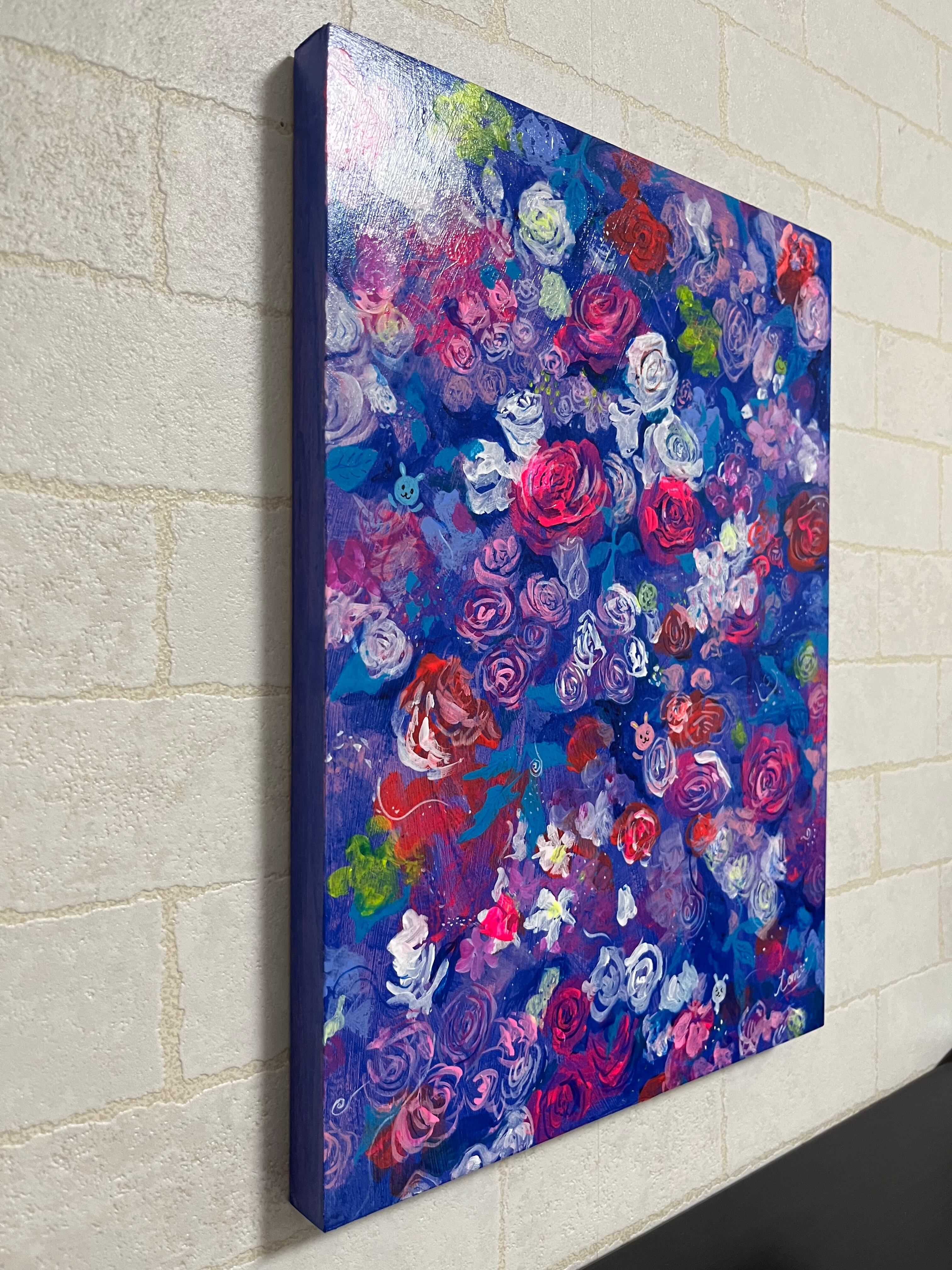 深いブルーを基調に、ピンクや白、赤の花々が軽やかに舞うように描かれ、